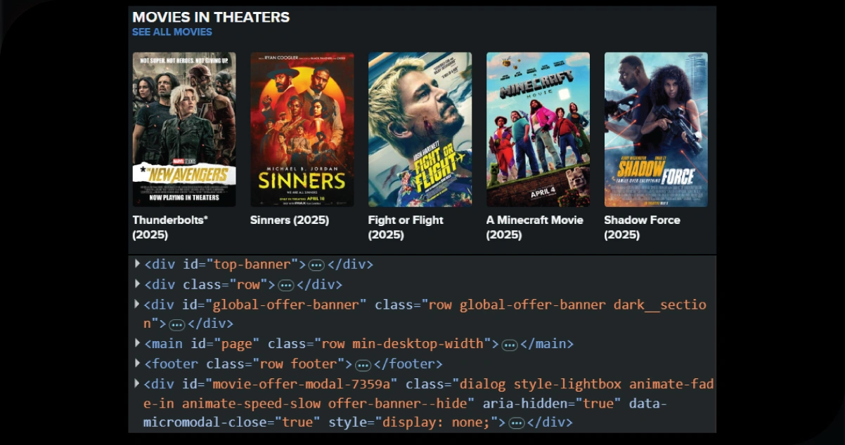 Before writing any code, it's essential to understand Fandango's HTML structure. Fandango's movie listings are typically found on pages like the "Movies" section, which displays films currently in theaters or coming soon. To identify the data points to scrape, use your browser's developer tools (usually accessed by pressing F12) to inspect the page.
