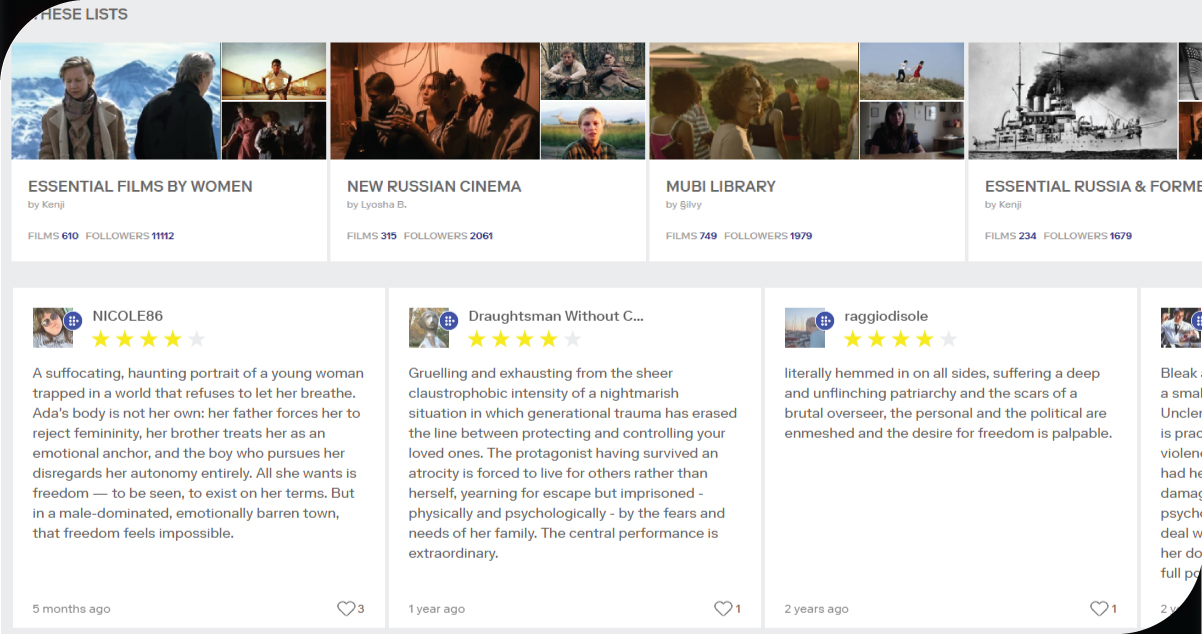 Furthermore, MUBI's focus on non-mainstream films gives it a globally diverse library, making it ideal for tracking international cinema movements, indie film popularity, and audience tastes across regions.