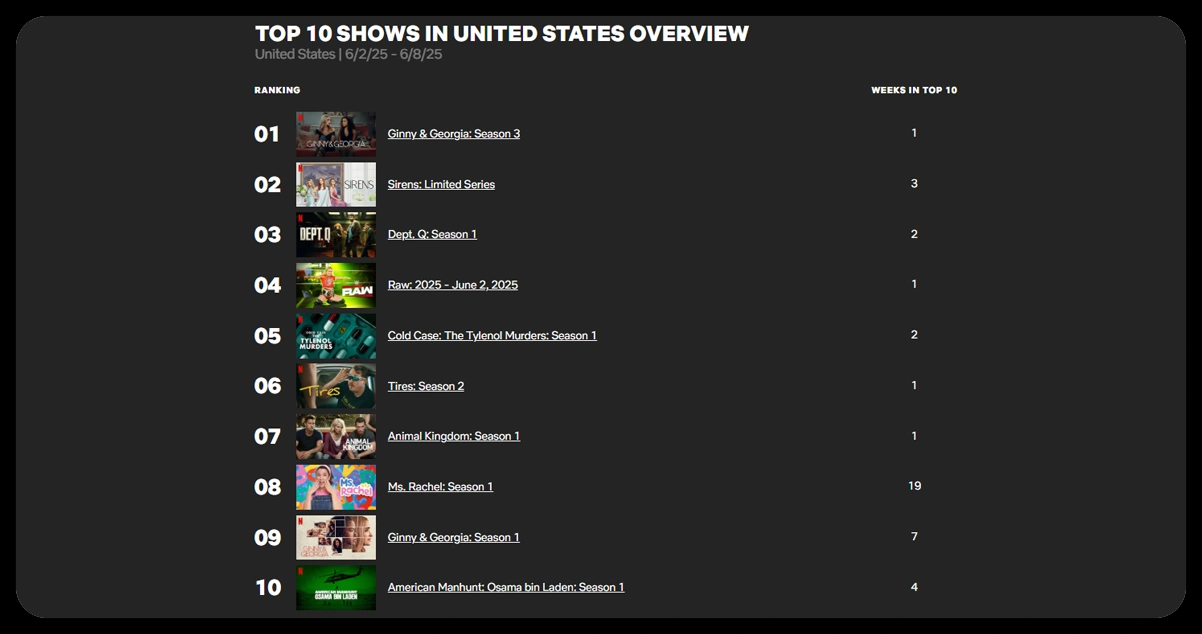 - Love Is Blind (US) – frequent Top 10 returner (high engagement spikes)