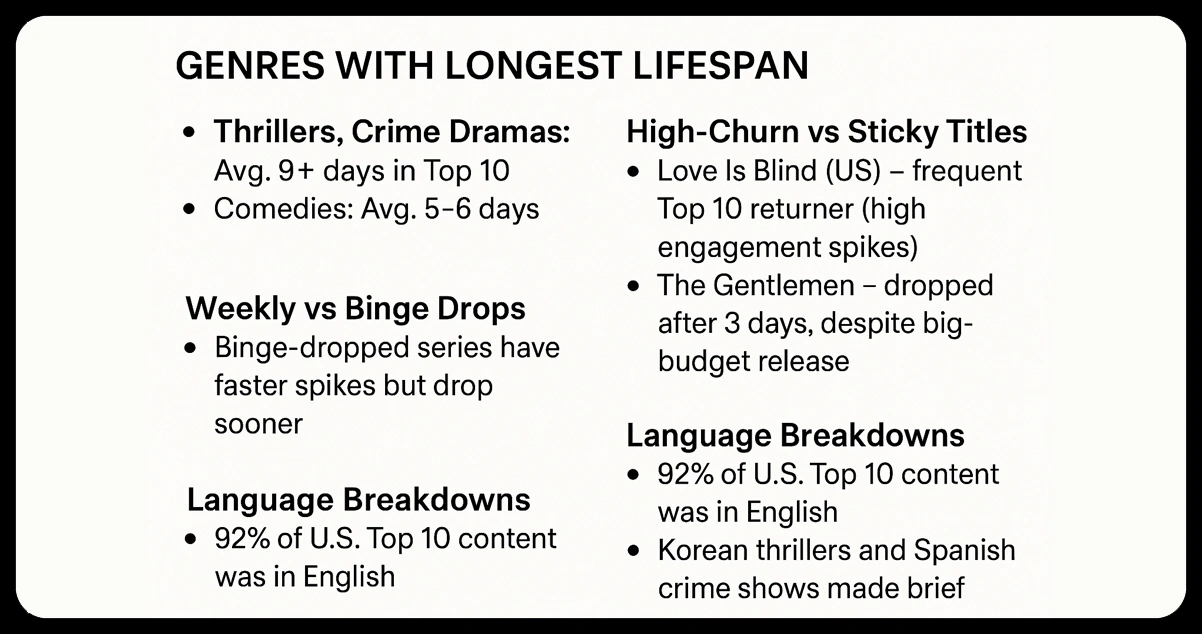 - Thrillers, Crime Dramas: Avg. 9+ days in Top 10