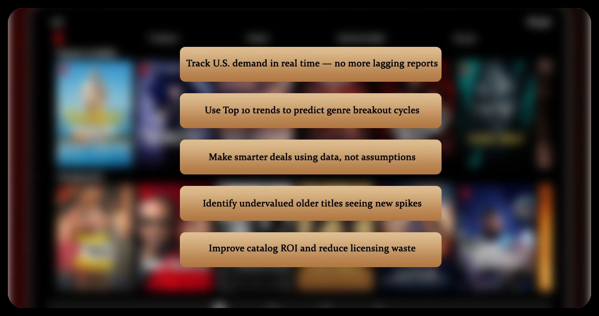 A global content licensing studio was actively exploring new titles to acquire or co-produce for U.S. audiences. Instead of relying solely on delayed viewership reports or insider signals, the team needed real-time visibility into what U.S. audiences were watching.