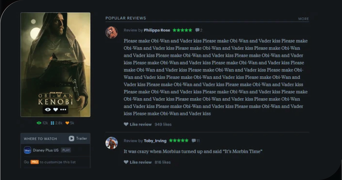 - Viewer reviews, likes, and watch counts