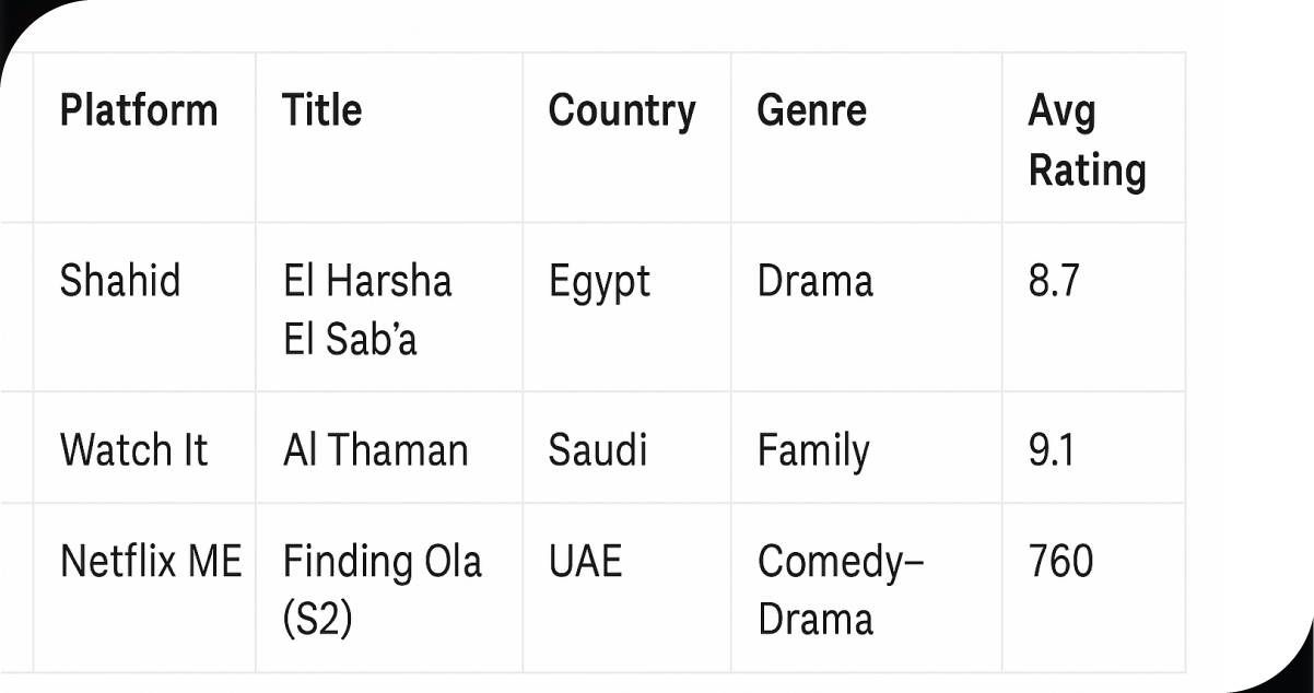 - Competitor trending lists from platforms like Shahid & Netflix MENA